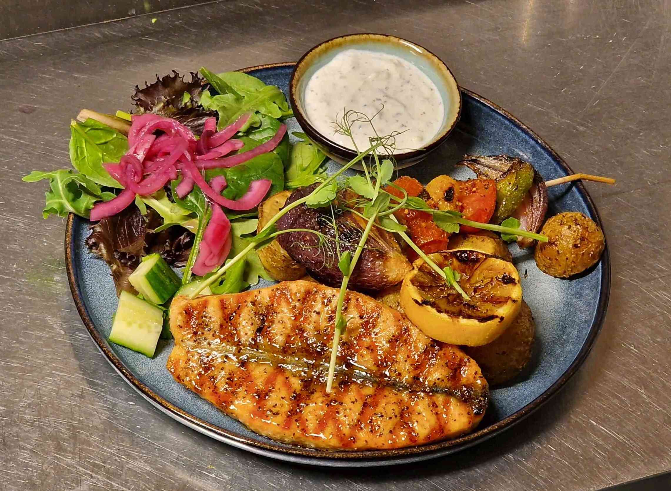 Kyckling,tomat, sallad, originaldressing och picklad rödlök servera